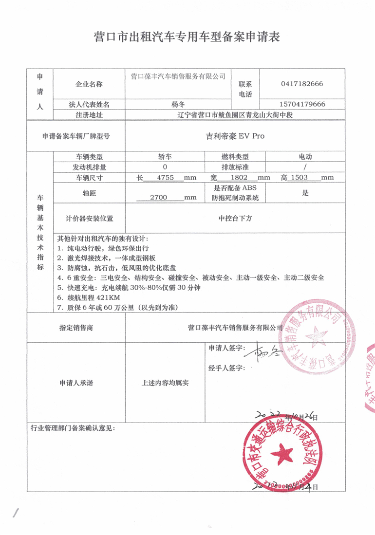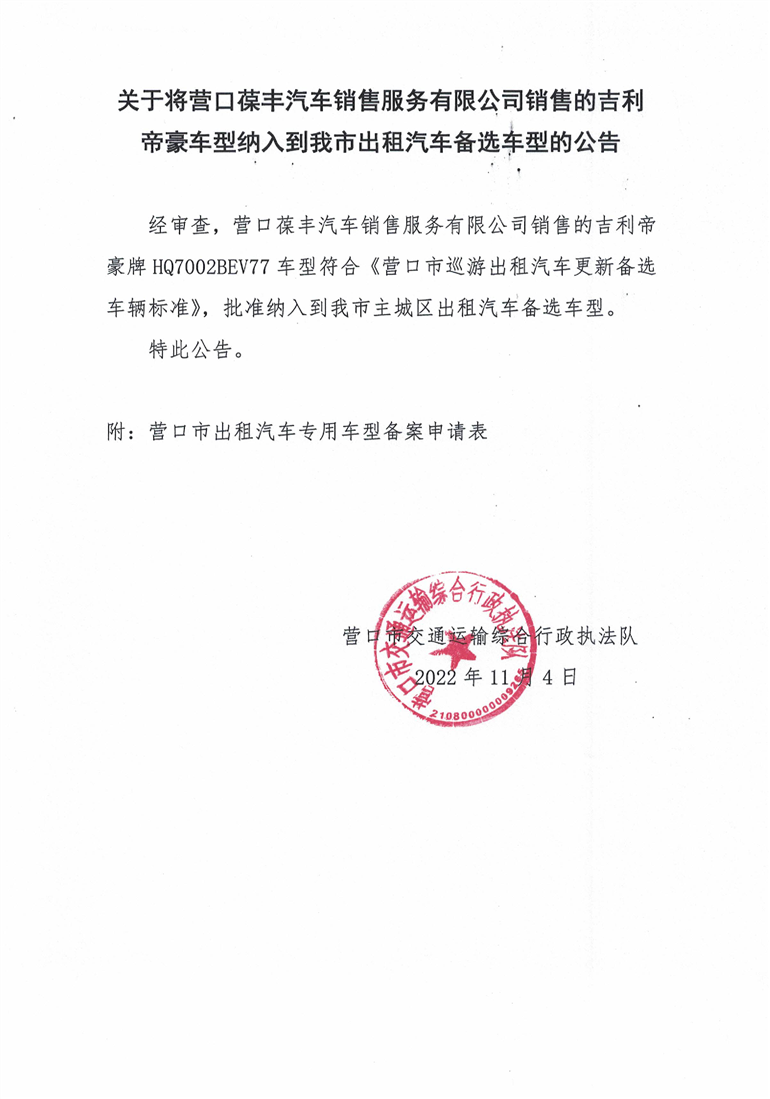 关于将营口葆丰汽车销售服务有限公司销售的吉利帝豪车型纳入到我市出租汽车备选车型的公告
